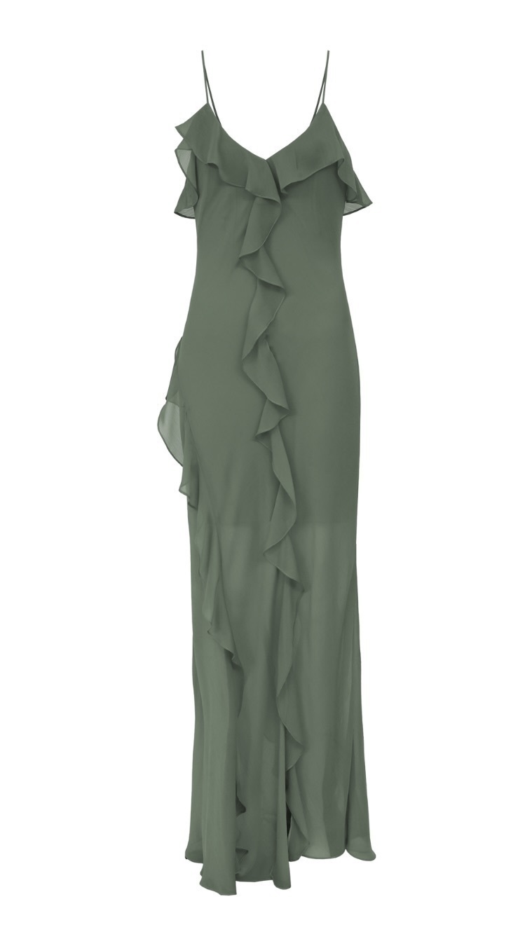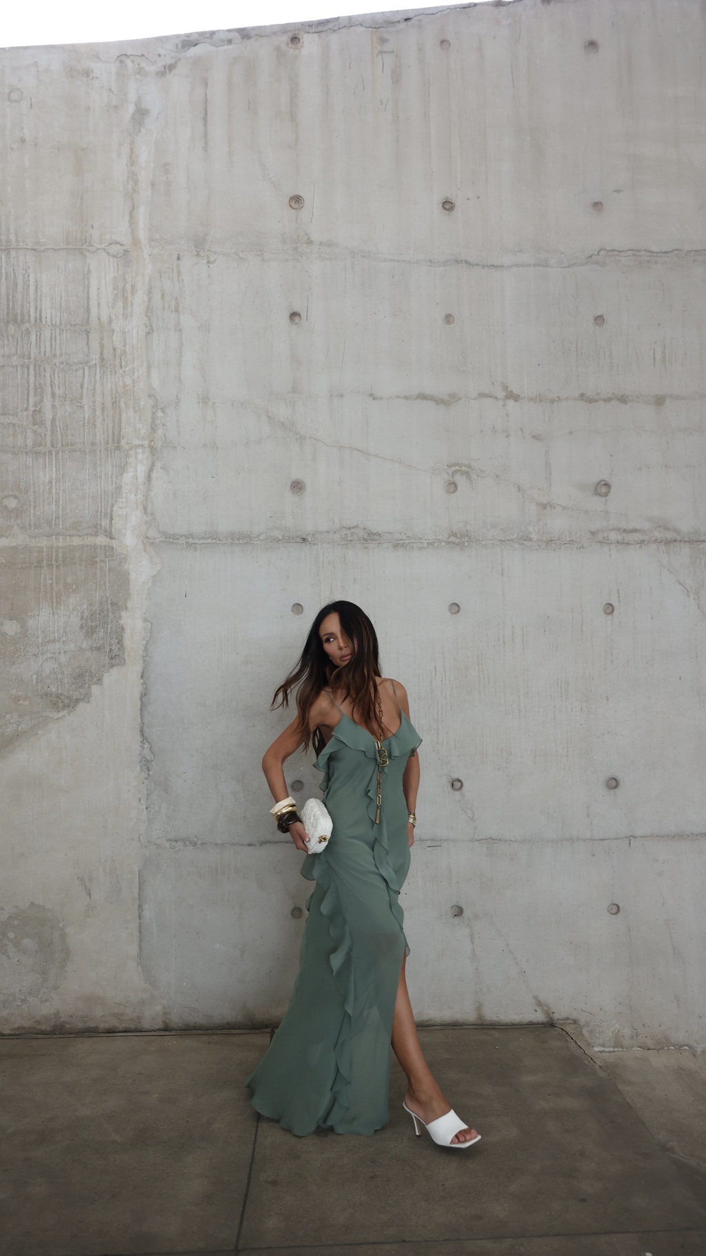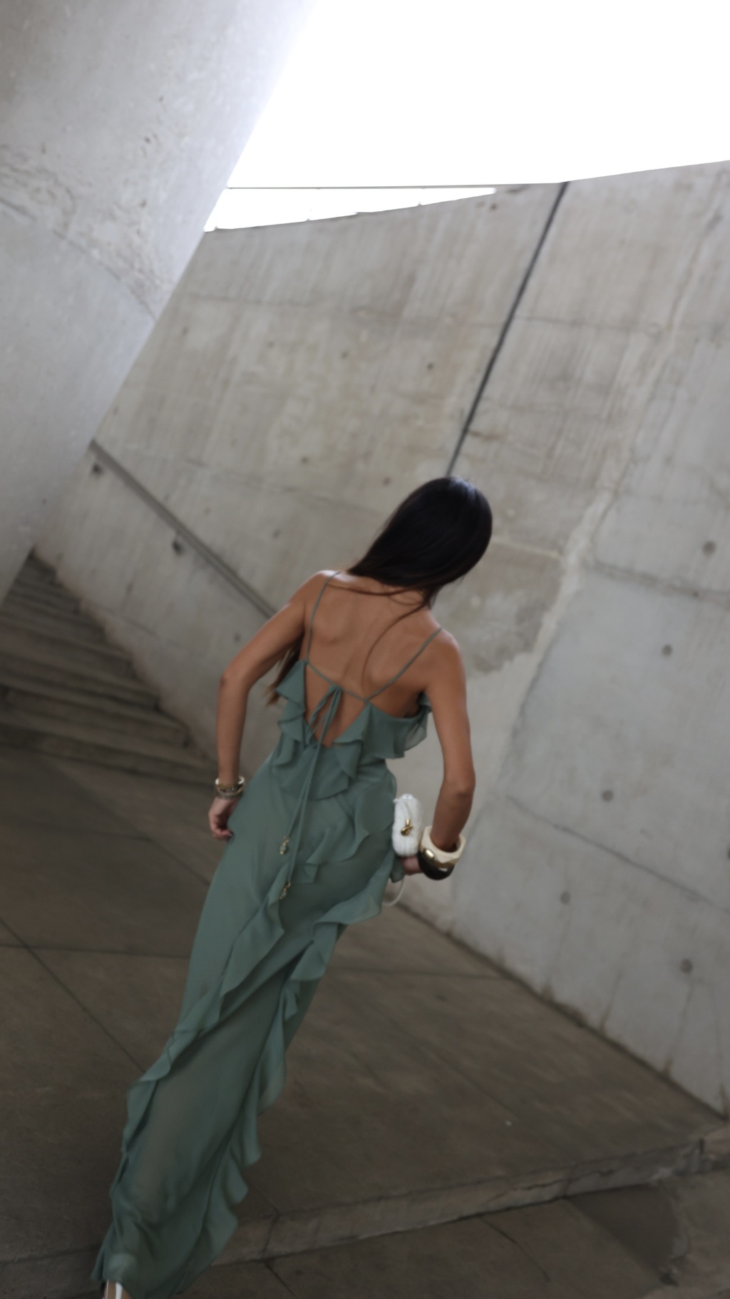 Descubra o charme do Vestido Malu Verde, uma peça longa com alcinhas delicadas e babados que transmitem leveza e movimento.